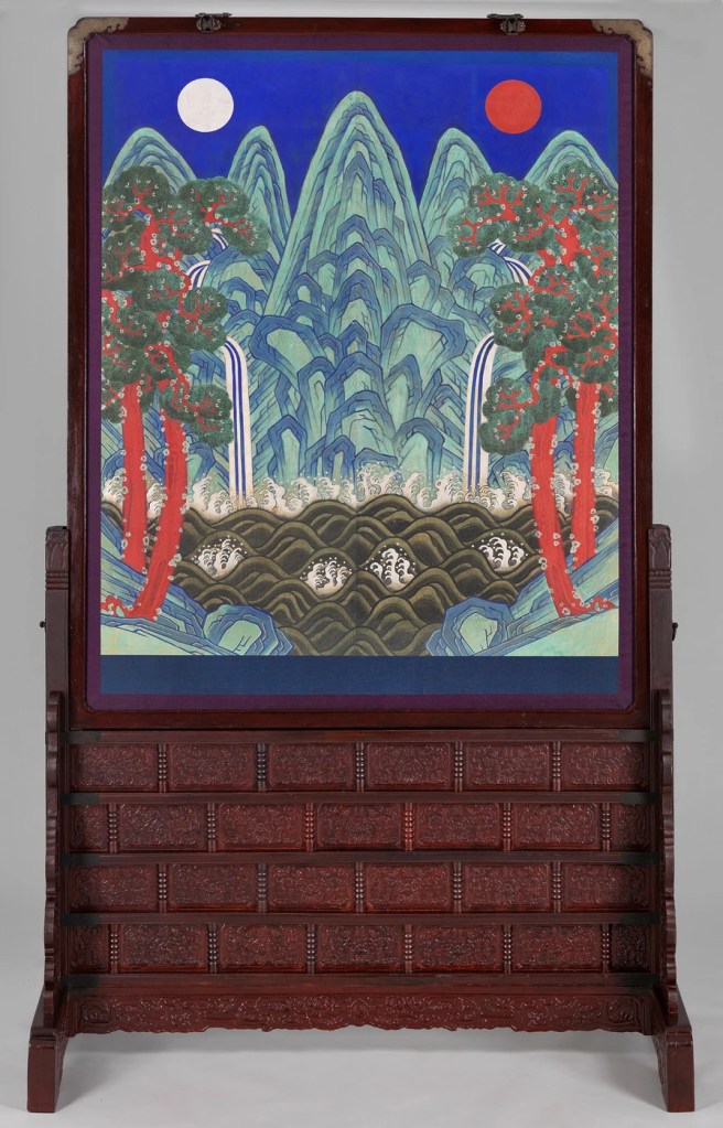 It looks like Ilwolobongdo, the iconic painting that sat behind Joseon kings’ thrones. It shows the sun, moon, five mountain peaks, waterfalls, waves, and two pine trees—all symbolizing the eternal reign of the Joseon Dynasty.